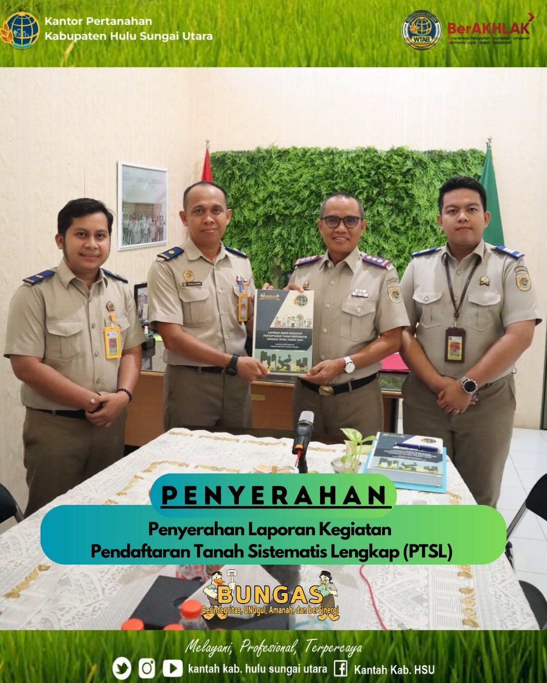 RILISKALIMANTAN.COM, KALSEL - Ketua Panitia Adjudikasi Pendaftaran Tanah Sistematis Lengkap (PTSL) Tahun 2024, Akhmad Sabirin, S.ST., bersama jajaran resmi pada Senin (6/1/2025) menyerahkan Laporan Kegiatan PTSL Tahun 2024 kepada Kepala Kantor Pertanahan Kabupaten Hulu Sungai Utara, Sofia Rachman. Acara ini menandai pencapaian penting dalam pelaksanaan program nasional PTSL yang bertujuan memberikan kepastian hukum atas kepemilikan tanah di wilayah tersebut.